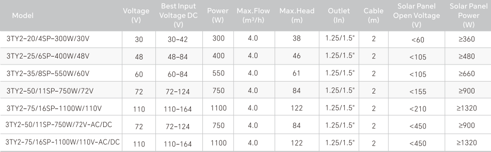 Max. outer diameter is 78mm ,and suitable for 3″ deep well. The pump useSolar energy as the main power supply, and can choose AC/DC manualswitching controller as optional.The pump is equipped with DC brushless motor, and MPPT controller. Thewhole pump use stainless steel screws and permanent magnet rotor, It hasthe advantages of small size, high efficiency, good starting performance,no pollution, reliable operation and so on.